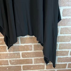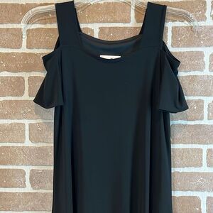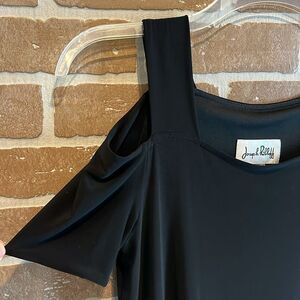 Joseph Ribkoff stretch black dress in size 6. Versatile and comfortable! Dress up or down. Tank straps with open shoulder design. Asymmetrical flowy hem. Chest measurement of approximately 17 across, length is approximately 38 inches to shortest point and then approximately 48 inches to longest point of hem. Dress is lined to thighs. Great quality and design in excellent condition.
