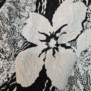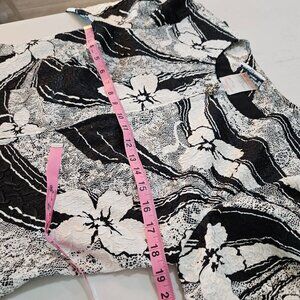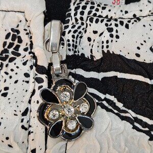 This floral jacket features a black and white large flower design with a zippered front and three-quarter sleeves. Ideal for layering with casual or dressy outfits.