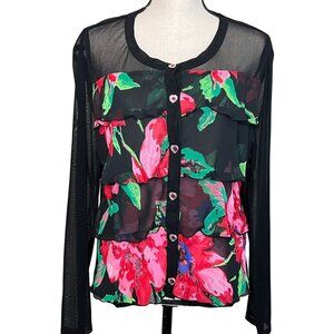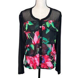 Joseph Ribkoff blouse, floral ruffle blouse, black sheer top, boho romantic blouse, heart button blouse, evening floral top, holiday dinner blouse, Joseph Ribkoff size 16 large, floral mesh blouse, luxury women’s top