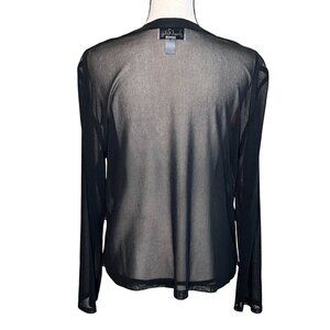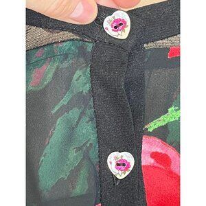 Joseph Ribkoff Floral Ruffle Black Blouse Size 16 Sheer Sleeves, Heart-Buttons