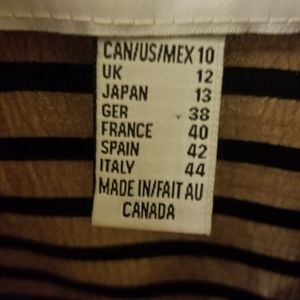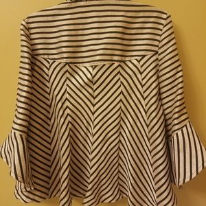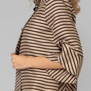 Mandarin collar lightweight jacket with an intriguing blend of horizontal and vertical stripes for a slimming effect. Oversized buttons in geometric shape and flared at the cuffs 3/4 sleeves. Perfect condition/ like new. Worn once to an event.