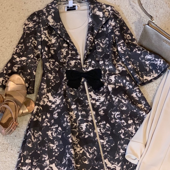 Black & cream floral Joseph Ribkoff jacket. Stylish and cute with 3/4 length sleeves and bell cuffs. There is a beautiful black bow to finish at waist. Pair with cream pants or black leggings for a fabulous look!