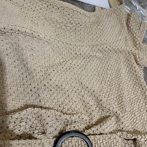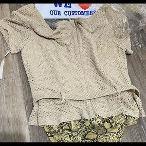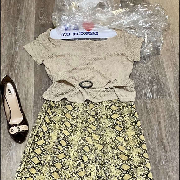 Tan belted knitted top material can wear off shoulder, with animal print pant. Super cute!