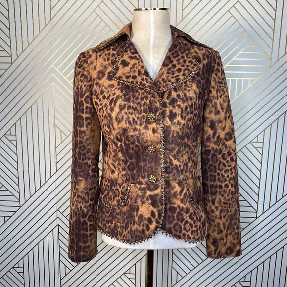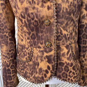 Stylish leopard print blazer. Features bold button details. Perfect for a chic look.