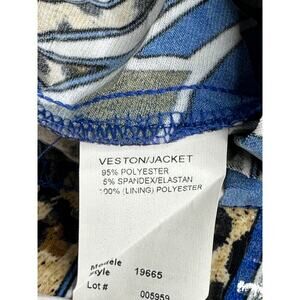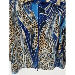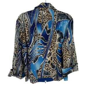 Featuring a striking leopard print in blue, brown, and black, this collared jacket has a zip-up front and is perfect for making a statement.