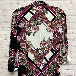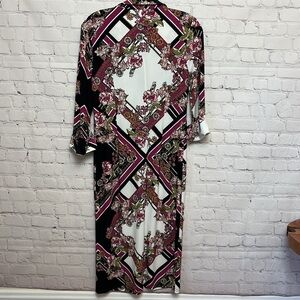 This magical look, a dress designed by Joseph Ribkoff, can easily transition from an office look to an enchanting evening style. Its lively pattern is baroque-inspired with chain prints, floral designs, and geometric lines all in one. With subtle gathering at the waist, you'll get a snug and stylish fit in this design.