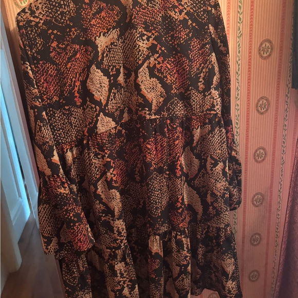 Chic dress with vibrant abstract patterns. Features a mix of black, brown, and orange hues. Ideal for a standout style.