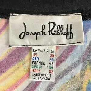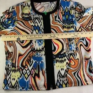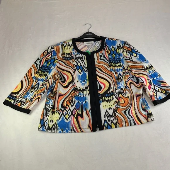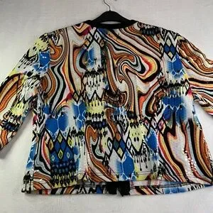 Vibrant abstract pattern. Open front design. Three-quarter sleeves. Perfect for a bold statement.