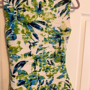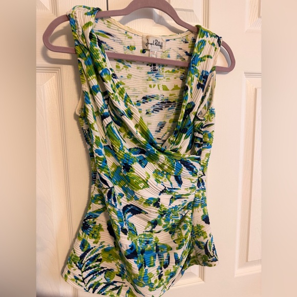 Stylish blouse with a vibrant mix of blue, green, and white. Features a flattering draped neckline.