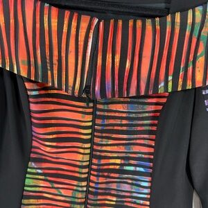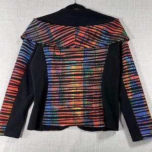 Bold blazer with multicolor stripes. Features a unique design. Ideal for a standout look.