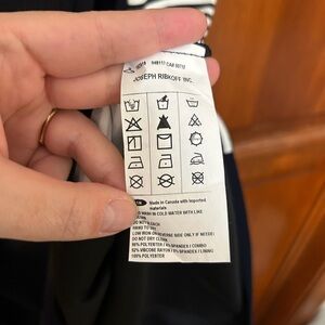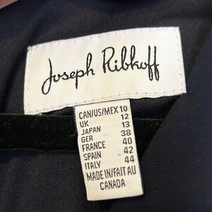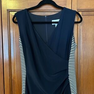 EUC sleeveless dress from Joseph Ribkoff in a size 10. This dress is navy blue with navy and white stripe details on the sides. Some ruching in the front for a very flattering fit. No stains or flaws!
