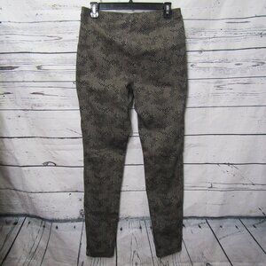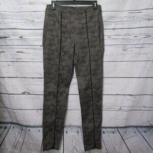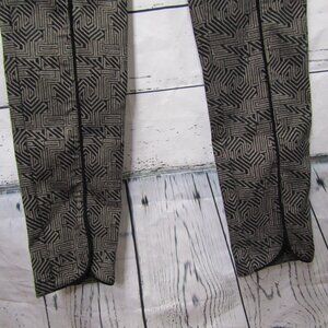 Size 10, Black and Tan, Vertical Seam Notched Ankle Skinny Stretch Pants Geo Print 183525, Geometric Print, Pull On Pants, Cotton, Polyester and Spandex blend but it is missing label, Black piping front vertical seam that ends with slit at hem. , Slim Fit, Elastic Waistband, Approximate measurements taken laying flat in inches: Waist 15", Front rise 10", Inseam 30"