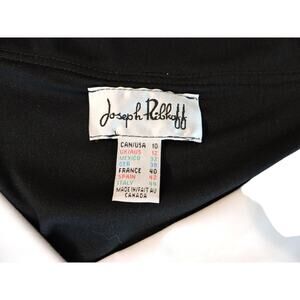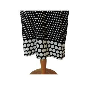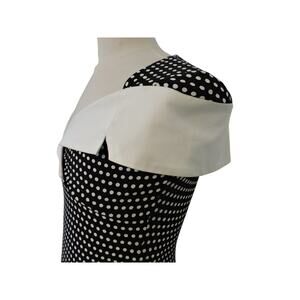 This Joseph Ribkoff dress is a charming addition to any wardrobe! It features a unique boat neck design with a white overlapped collar that gracefully extends around the back. The dress showcases a delightful small white polka dot pattern set against a classic black background. Adding a touch of flair, the bottom border is adorned with larger polka dots.