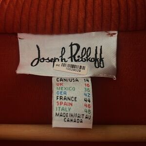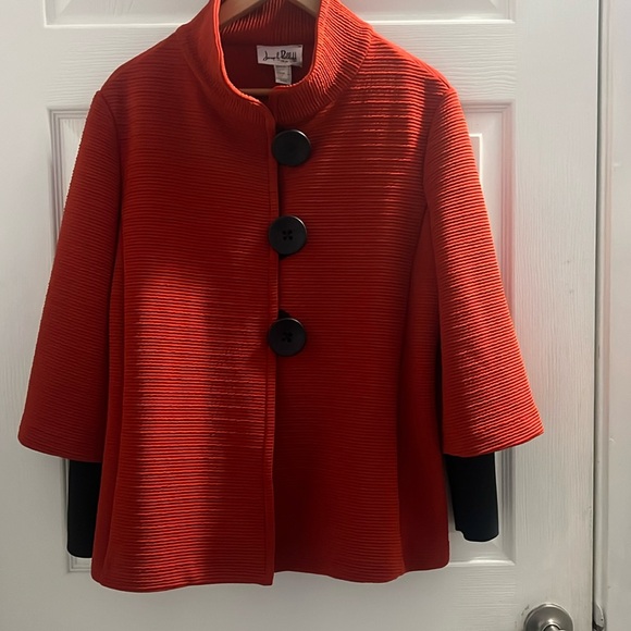 Elegant red blazer with textured fabric. Features large black buttons. Three-quarter sleeves.