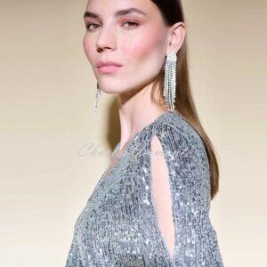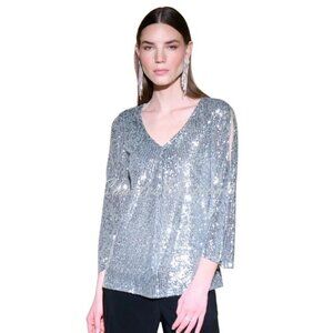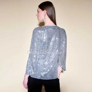 Joseph Ribkoff Sequin V Neck Top Silver Womens Size 8 Split Sleeves Party Formal