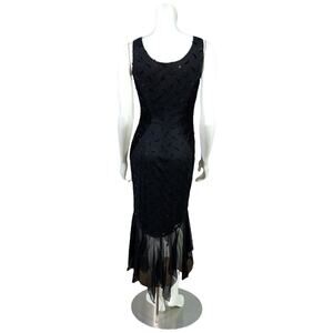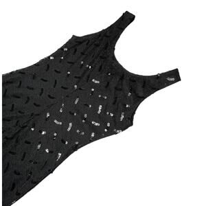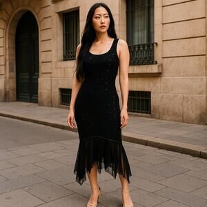 This vintage cocktail dress is a total vibe, dripping with 90s glam and ready to make you the star of any event. Fitted silhouette that hugs your curves, sparkling with allover black sequins that catch light, scoop neckline, sheer asymmetrical chiffon hem adds a flirty, flowy twist. Perfect for formal soirées or elevating your vintage collection. In great shape, with every sequin shining and no flaws to dim its dazzle. Pair with strappy heels and bold earrings for a look that Is a whole moment. Snag this unique find and let its sophisticated sparkle steal you the show!