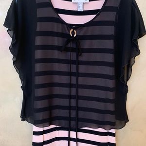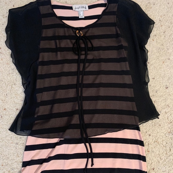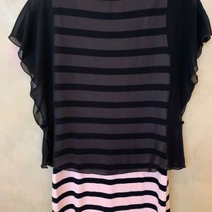 Joseph Ribkoff pink & black striped top. Pair with black pants for an elegant outfit! Like new! Top has a sheer black overlay creating a flattering look!
