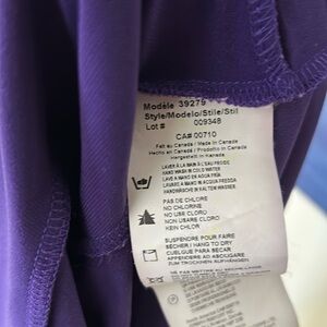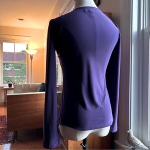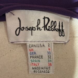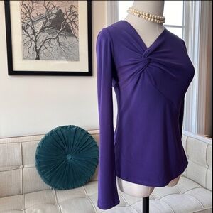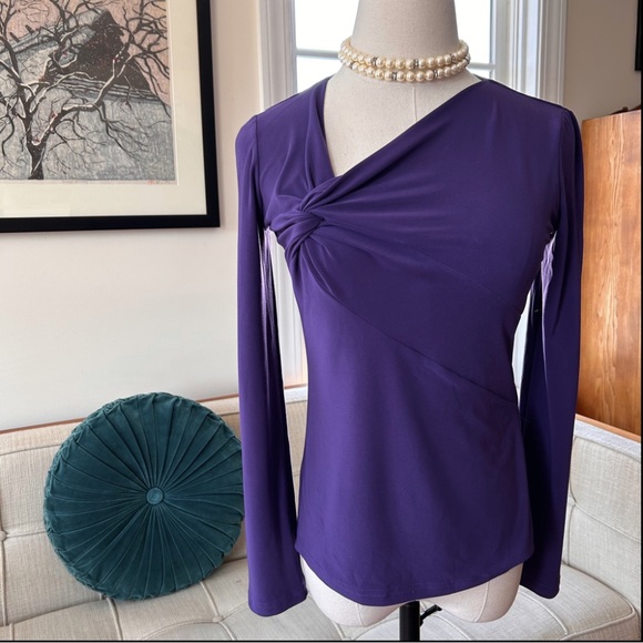 Form-Fitting, Stretchy Joseph Ribkoff Top with an Asymmetrical Neckline, in Grape. The fabric twists & subtly drapes around the bustline on the right side, creating a flattering look. There is a snap closure. Size 2. Shown on my Size 2/XS dress form and it fits her perfectly. Made in Canada, of 94% Polyester and 6% Spandex. EUC.