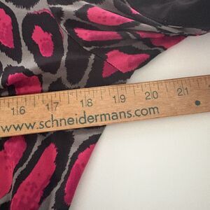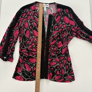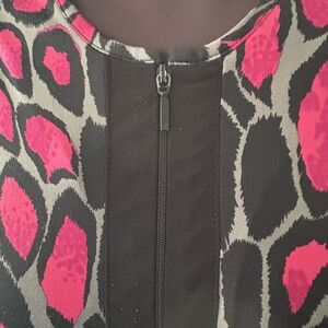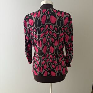 Additional Information: light signs of wear and minor fuzzies present; no holes or stains, Vivid pink, black, and gray animal-inspired print with ruched sides and sleeves, Features a full zip front closure, Three-quarter sleeves with ruched detailing
