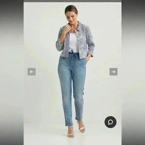 Designed in soft blues and whites, this Joseph Ribkoff tweed-inspired knit blazer is a fabulous look to help you achieve stunning office style. It features bold, colourful buttons, a notched collar, and has a cropped fit, giving you a professional and confident style for wherever life takes you.
