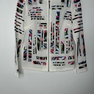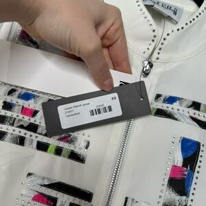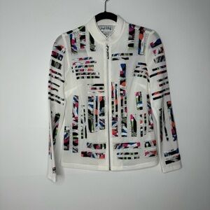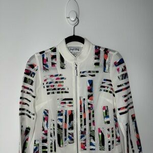 Joseph Ribkoff Vecceli multicolor embellished full zip mesh jacket NWT white with multicolor patches