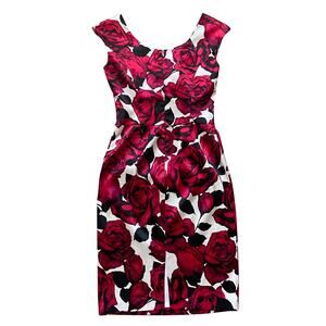 Turn heads in this rare vintage Joseph Ribkoff satin sheath dress featuring a stunning allover red rose floral print. With a sleek fitted silhouette, bateau neckline, and darted bodice, this dress exudes timeless elegance and romantic flair.