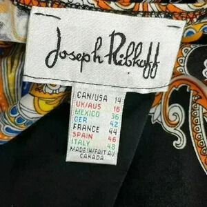Turn heads in this vintage Joseph Ribkoff dress, featuring a bold paisley print and an easy, flattering silhouette. With short sleeves and a scoop neckline, this stretchy jersey-style dress is perfect for work, brunch, or any casual-to-dressy occasion.