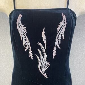 Elegant velvet evening gown with spaghetti straps + embellished bodice; full length and timeless for formal or vintage-goth styling.