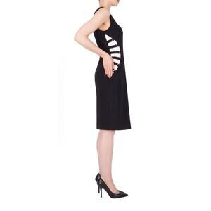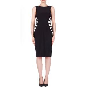 Joseph Ribkoff abstract dress, women’s black and white midi dress, silky knit dress, designer sheath dress, Joseph Ribkoff size 8 dress, abstract print knit dress, midi length dress, elegant work dress, travel-friendly dress, Joseph Ribkoff classic dress