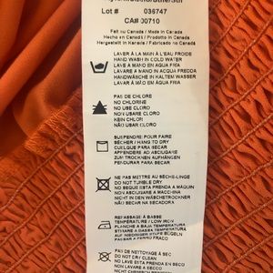 This is an orange tone. Sleeves are a “dolman” type short to mid sleeve. Or some may call it a “batwing” type sleeve. See photos.