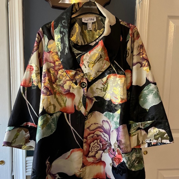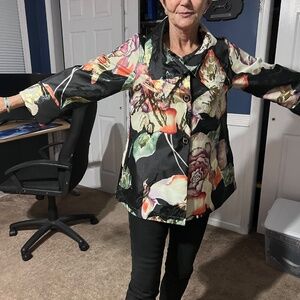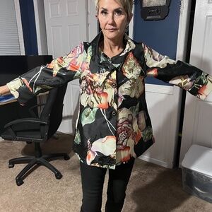 Beautiful bold floral print on black, swing fit. Works with jeans or dressed up.