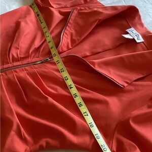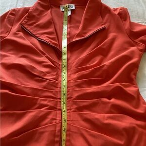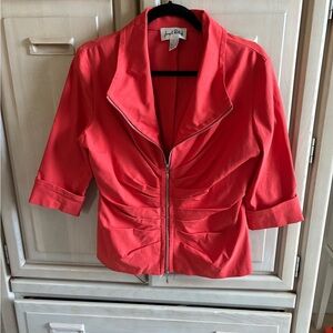 Beautiful Joseph Ribkoff ruched front jacket. Double zippers. 3/4 sleeves. Color is between bright orange and red. Made in Canada. Like new condition.