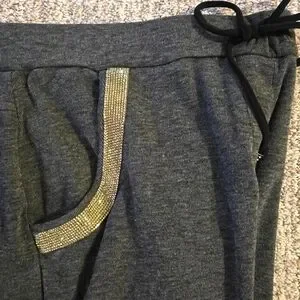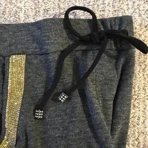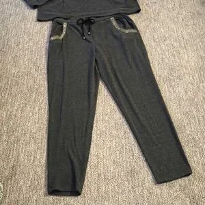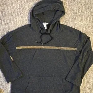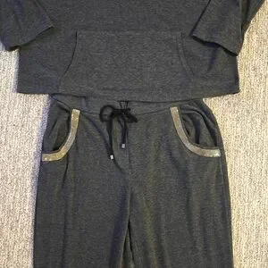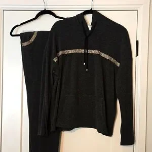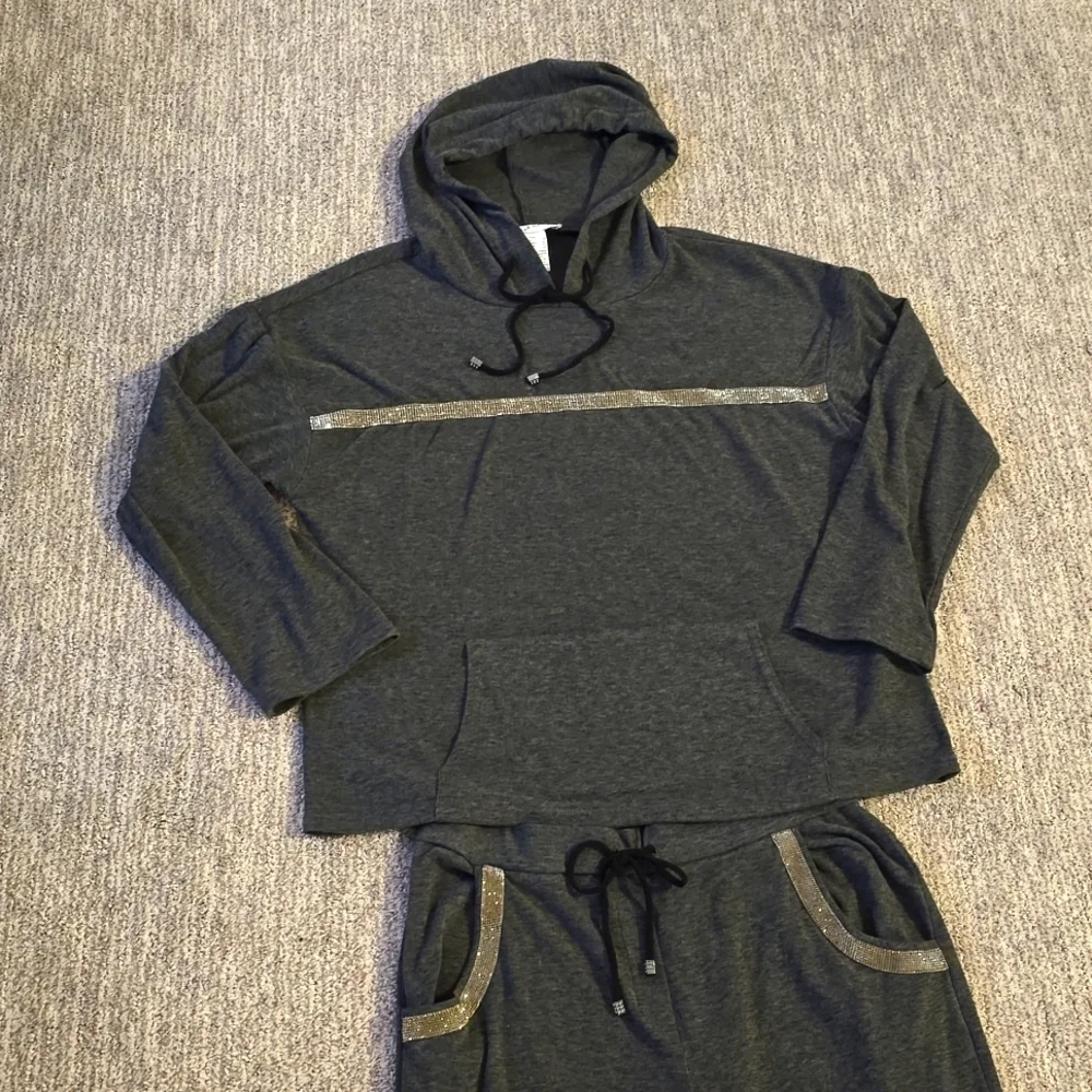 Joseph Ribkoff set, size 10, dark Grey with black drawstrings. Rhinestone details!! Hello NYE party! So cozy, stretchy, and soft - hooded, drop shoulder top with rhinestone band. 27" from neckline to sleeve hem. 26" from shoulder/neckline to waist hem.