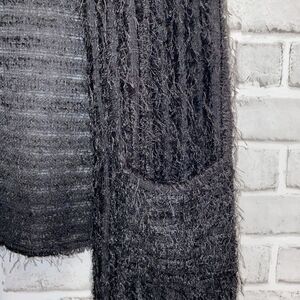 Joseph Ribkoff Stretchy Black Waterfall Topper Vest Eyelash stretchy knit waterfall open front vest. Front is longer than back, front patch pockets. Fiber content tag has been removed, it's typical stretchy knit in a striped pattern with eyelash all over.