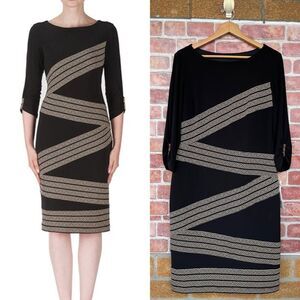 Fitted black dress with mid-length sleeves, and detailed geometric patterns. Knee length hem, concealed side zipper and fully lined. Stretchy material colors are black beige and gold hardware