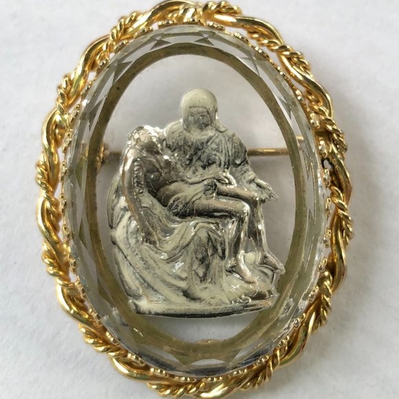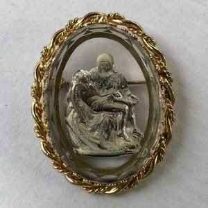 Joseph Warner brooch, Mary holding Jesus pewter figure set in glass with gold tone setting. Pin measures approximately 2” long by 1 ½” wide. This item is vintage from the 1970’s. In very good condition, a few scuffs in the glass that are only visible upon very close inspection.