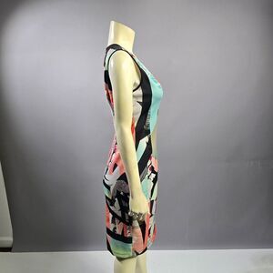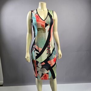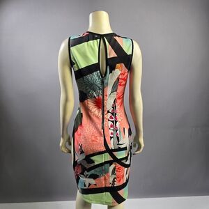 Bold sleeveless dress with a vibrant pattern. Features a mix of black, pink, and green hues. Perfect for making a statement.