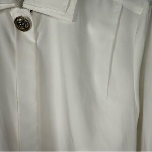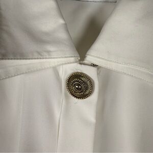 White Color Full Button Up Large Gold Button Detail Size Small Has Collar Great Pre-Owned Condition 100% Polyester Length- about 25” Width (Pit to Pit)- about 21.5”