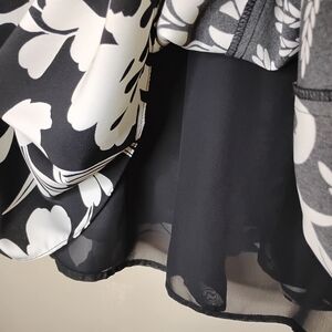vintage Josephine Chaus, classic office wear, Y2K minimalist, 90s does 70s, flowy midi skirt, feminine chic, timeless silhouette, retro inspired, elegant modest skirt, black and white print, floral abstract, garden party skirt, lightweight chiffon, A-line skirt