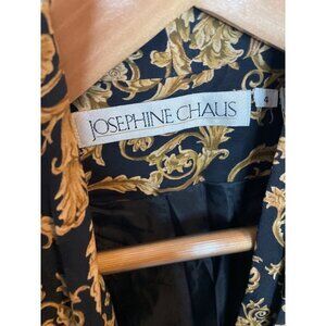 This Josephine Chaus blazer in size 4 boasts an elegant black and gold scrollwork design. It's buttoned and made from high-quality rayon, imbuing both comfort and style.