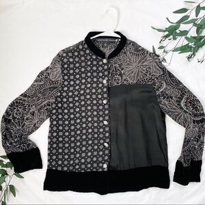 Josephine Chaus Black White Block Floral Design Button Down Blouse Velvet Trim