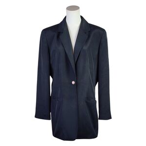 Step into timeless sophistication with this vintage Josephine Chaus Collection black silk blazer, size 12. Crafted from 100% silk with a smooth polyester lining, this elegant piece features a classic tailored silhouette, sharp notched lapels, and a striking single-button closure adorned with an ornate pink cabochon-style button for a touch of vintage glam. Matching decorative buttons line the cuffs, adding extra charm and character.