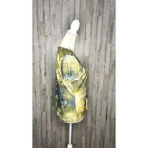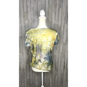 The Josephine Chaus Sport T-Shirt in size M features a multicolor floral pattern. Made from polyester, it has a scoop neck and short sleeves, offering a basic style suitable for various casual occasions. This women's regular fit shirt is machine washable and made in the USA. Pre-owned. Keywords: Josephine Chaus, Sport T-Shirt, floral top, women's casual wear, scoop neck, short sleeve, multicolor shirt, polyester tee, basic style, USA made, machine washable, pre-owned women's clothing.