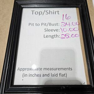 Approximate flat measurements: Pit to pit/bust: 24 in, Sleeve: 10 in, Length: 25 in (see measurement photo for reference)