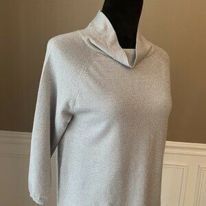 Josephine Womens Petite Medium Gray/ Silver Shimmer Rayon Nylon Sweater. In great used condition !! Looks and feels new !! High cowl neck. Thin knit rayon blend. Good stretch to fabric. 3/4 sleeve. 36" chest and 27" length.