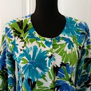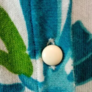 Josephine Studio printed white enamel button front top, with 3/4 length sleeves.