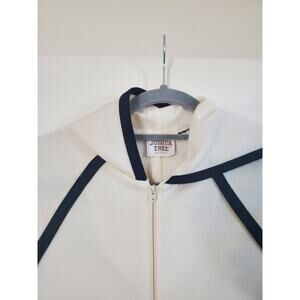 Style: Retro, fun stretchy jumpsuit. Hooded with contrasting trim. Zip closure up front bodice. Long sleeves with elastic at wrists. Drawsting/elastic waistline. Front kangaroo-style pocket (divided by zipper). Slim fit bodice. Full length, extra long legs. Wide leg silhouette. Stretchy and textured material. With inner finish could be hand-made. No material tag. Machine Washable.