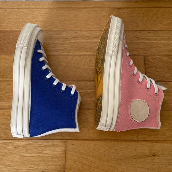 The White Hi Joshua Vides Converse Chuck Taylor All-Star 70 features a pair of contrasting shoes. One shoe boasts a yellow, egret, and blue colorway while the other shoe features a red, egret, and green colorway. The shoe also has a leather patch on the heel with the Converse logo.