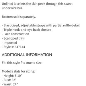 Sweet lace bra with partially lined underwire cups - wide 3 hook adjustable back and adjustable straps- NWT - 32b/c