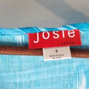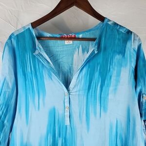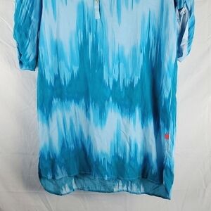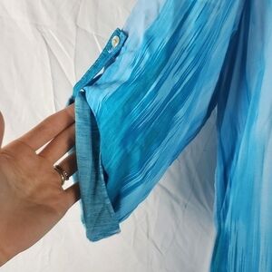 Josie Natori Blue Tunic Top. Ombre shades of blue. Sleeves can be rolled and buttoned. Partial button front. 1 small threadbare spot as shown in last picture. Size small.